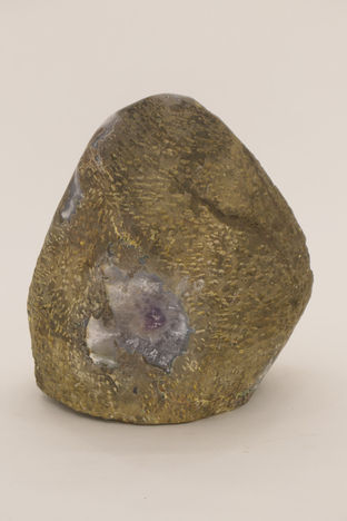 Améthyste d'Uruguay constituée de cristaux très fins violets formant des sphères. L'arrière et les bords sont en pierre brute.